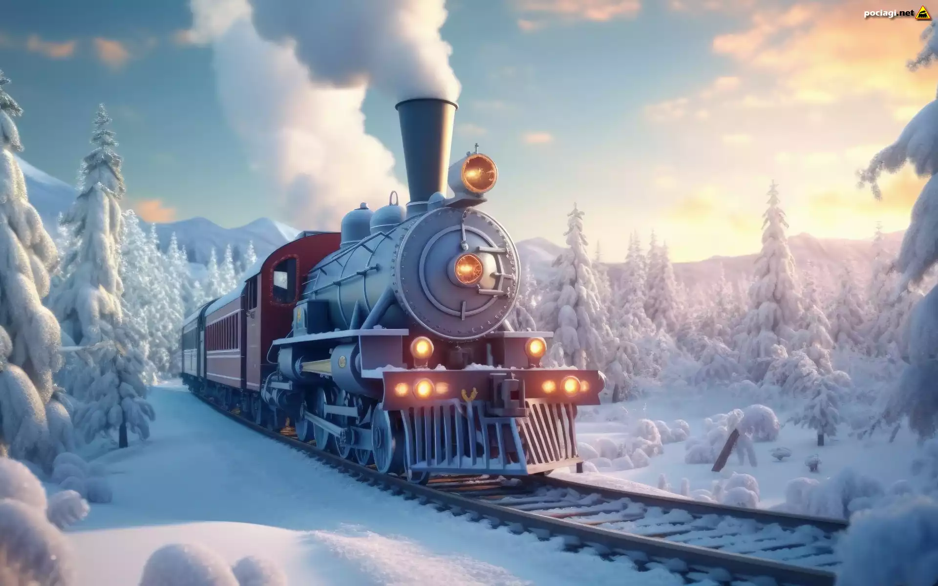 Zima, Las, Drzewa, Śnieg, Pociąg, Tory, Niebo 2D