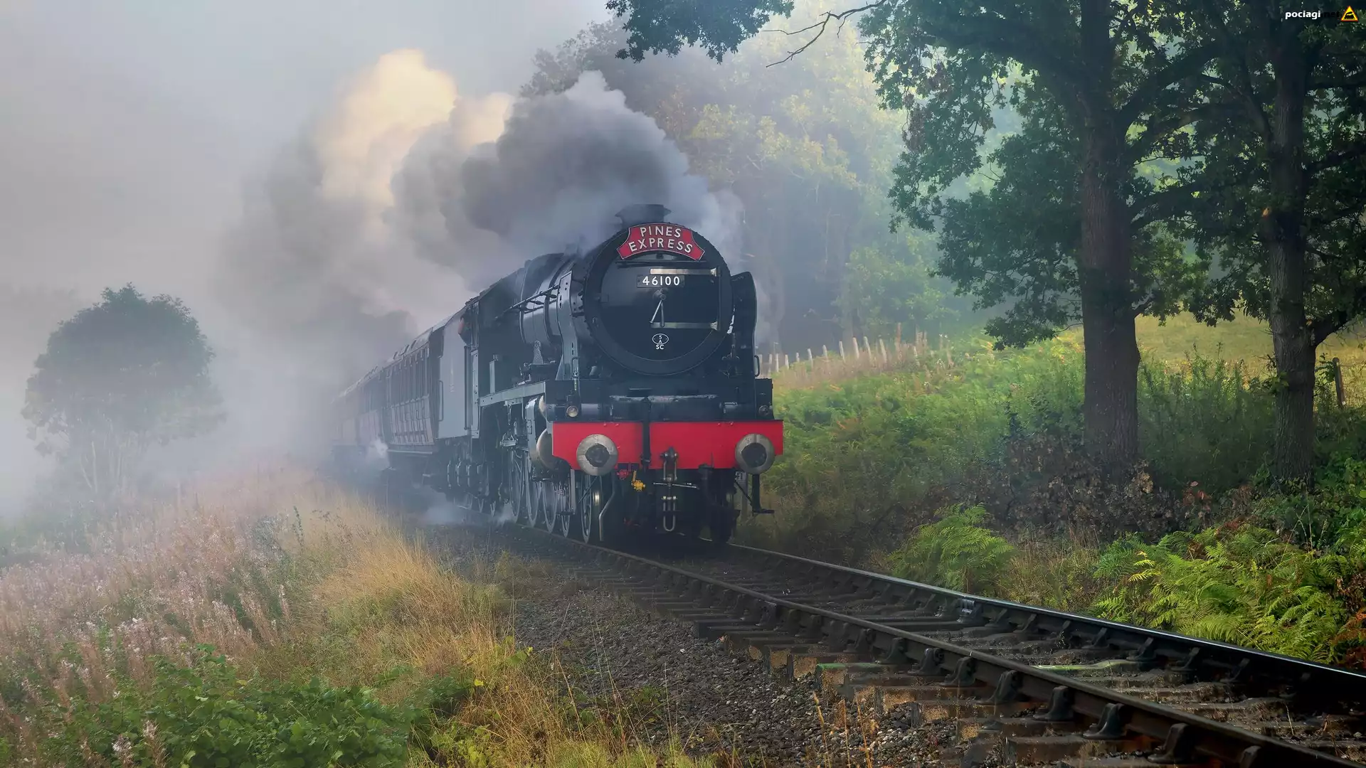 Pociąg parowy, Szyny, Dym, Drzewa, Rośliny