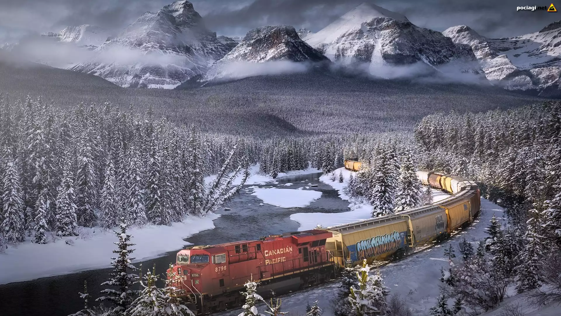 Góry Skaliste, Zima, Drzewa, Las, Rzeka, Bow River, Park Narodowy Banff, Pociąg, Chmury, Alberta, Kanada |