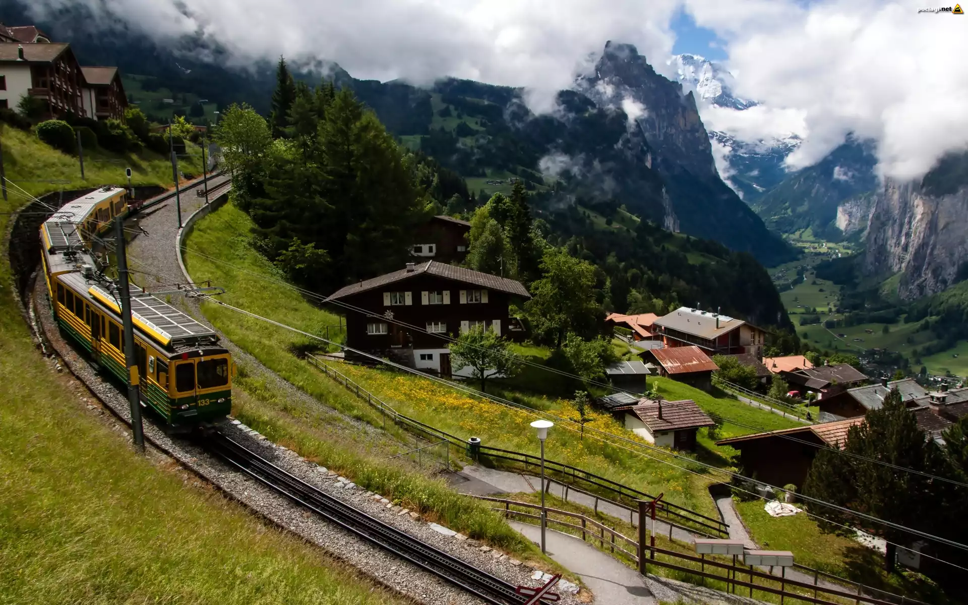 Domy, Kolej, Pociąg, Góry, Chmury, Lauterbrunnen, Szwajcaria