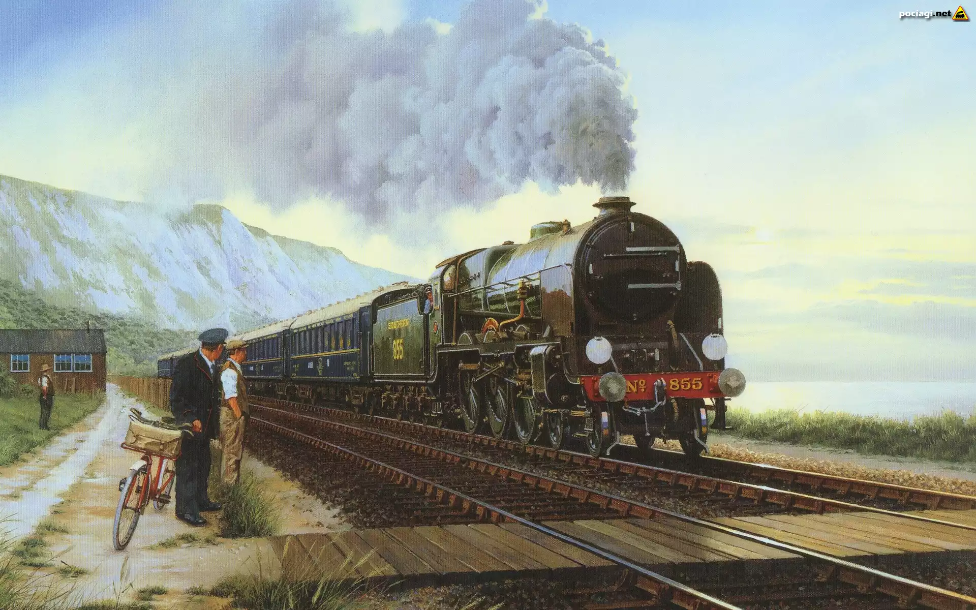 Pociąg, Lokomotywa parowa, Tory, Ludzie, Budynek, Góry, Grafika
