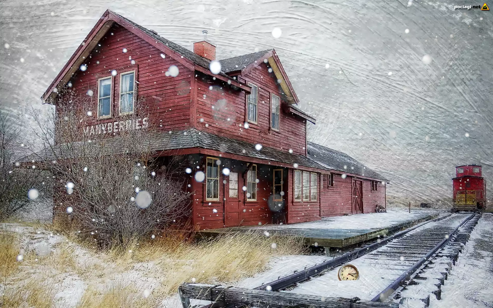 Lokomotywa, Spalinowa, Tory, Dworzec, Śnieg, Zegarek