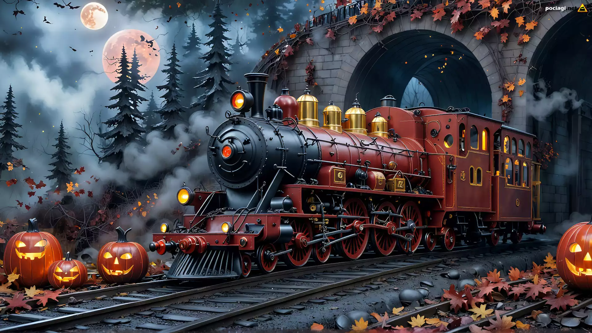 Grafika, Pociąg, Lokomotywa, Most, Drzewa, Dynie, Grafika