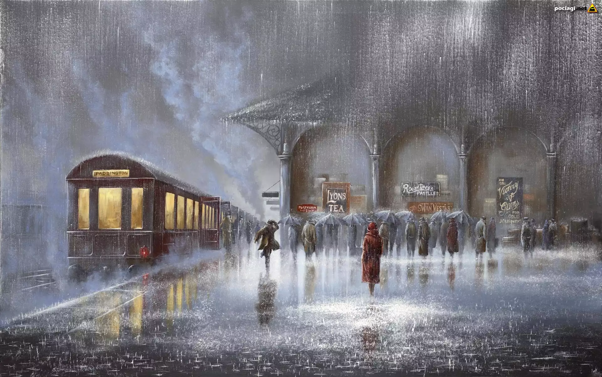 Obraz, Peron, Pociąg, Deszcz, Ludzie, Parasole