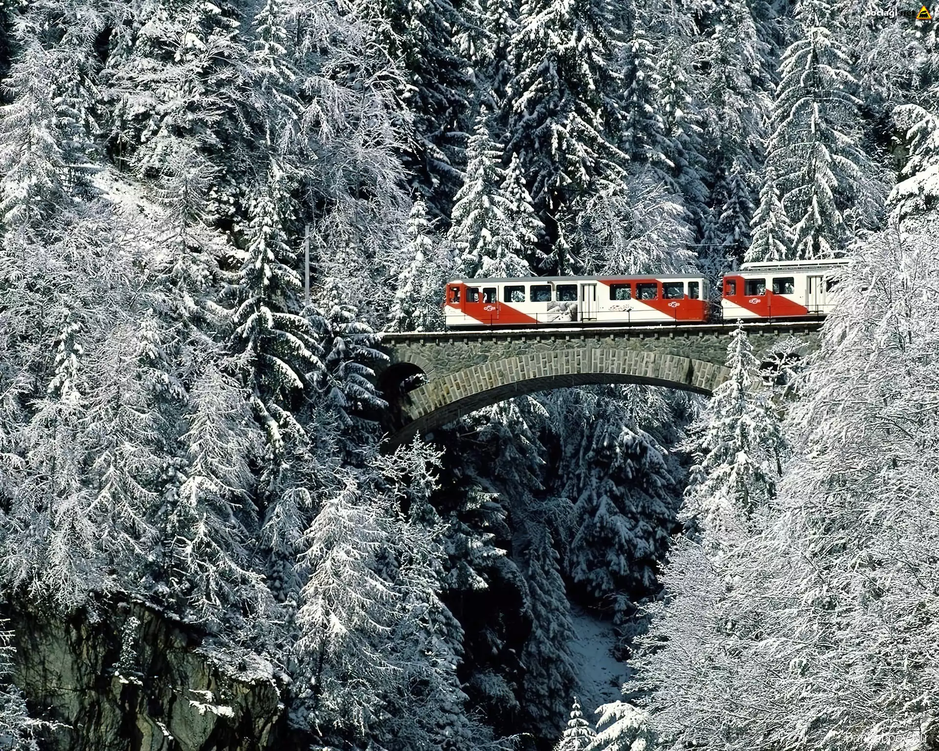 Ośnieżone, Drzewa, Zima, Most, Pociąg