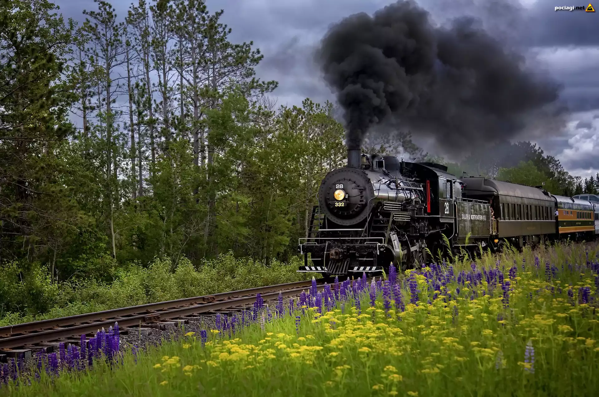 Lokomotywa parowa, Pociąg, Czarny, Dym, Kwiaty, Łubin, Drzewa