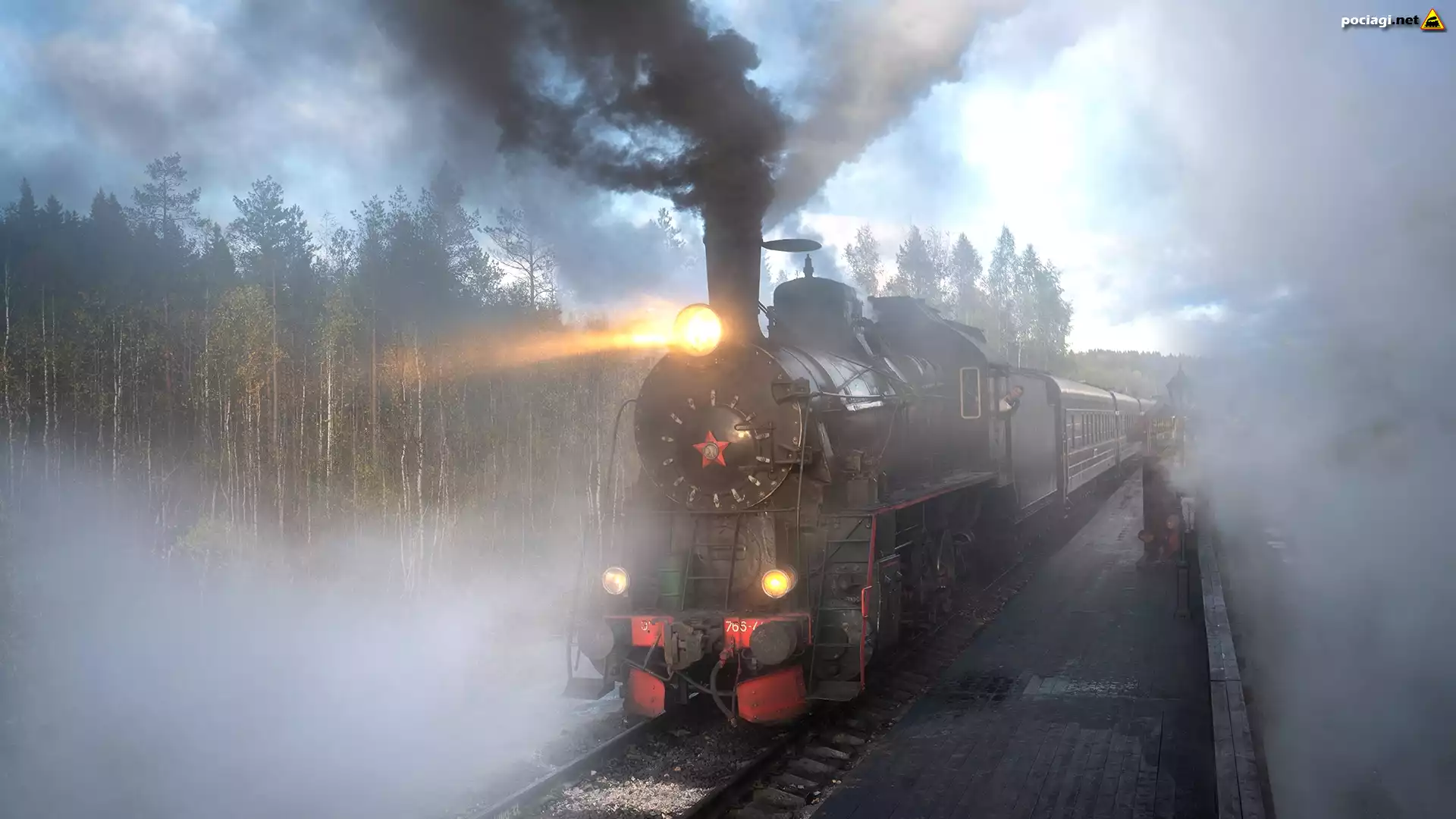 Lokomotywa parowa, Pociąg, Dym, Mgła, Peron, Drzewa