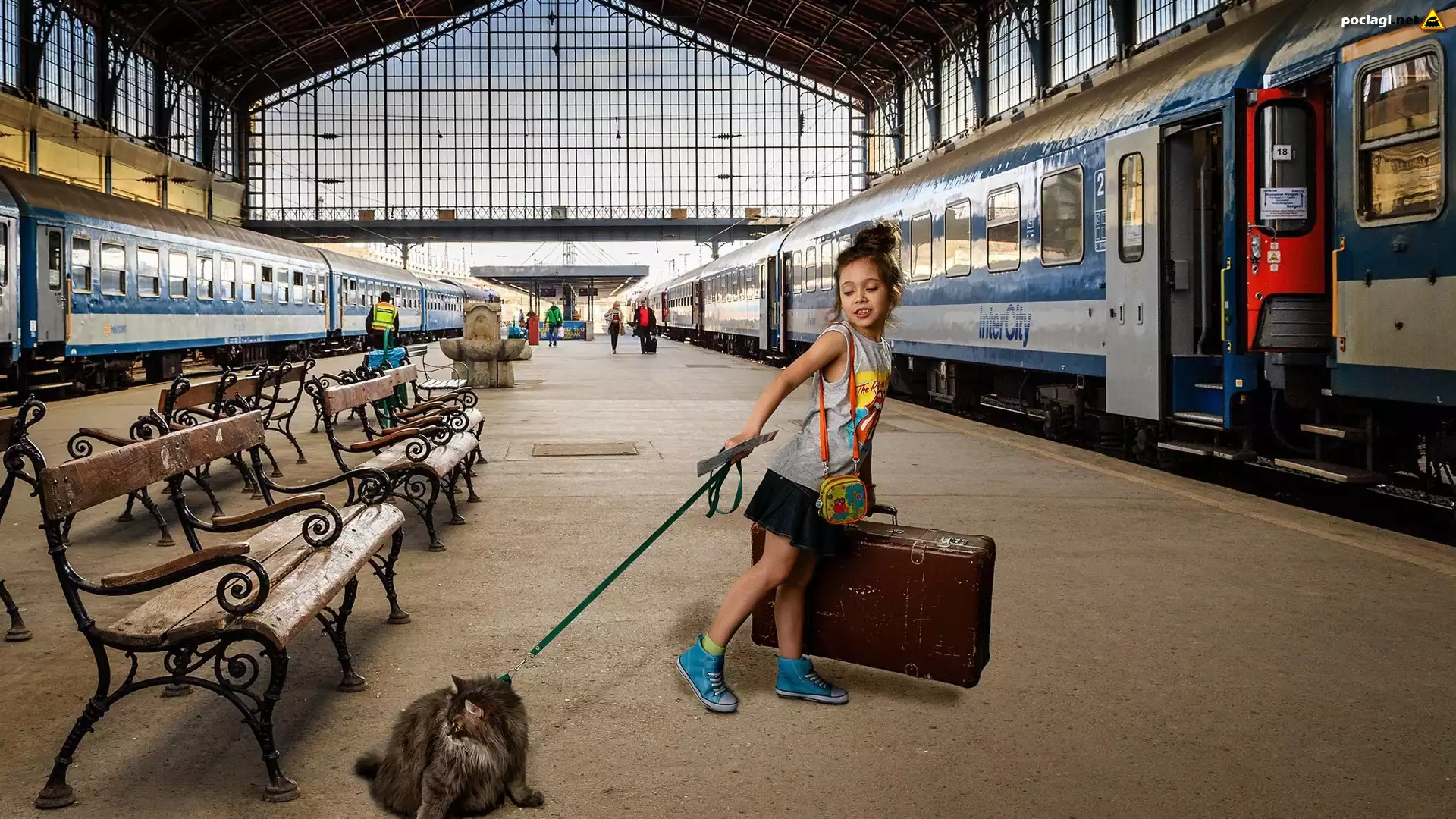 Pociągi, Peron, Dziewczynka, Kot, Walizka, Ławki, Smycz