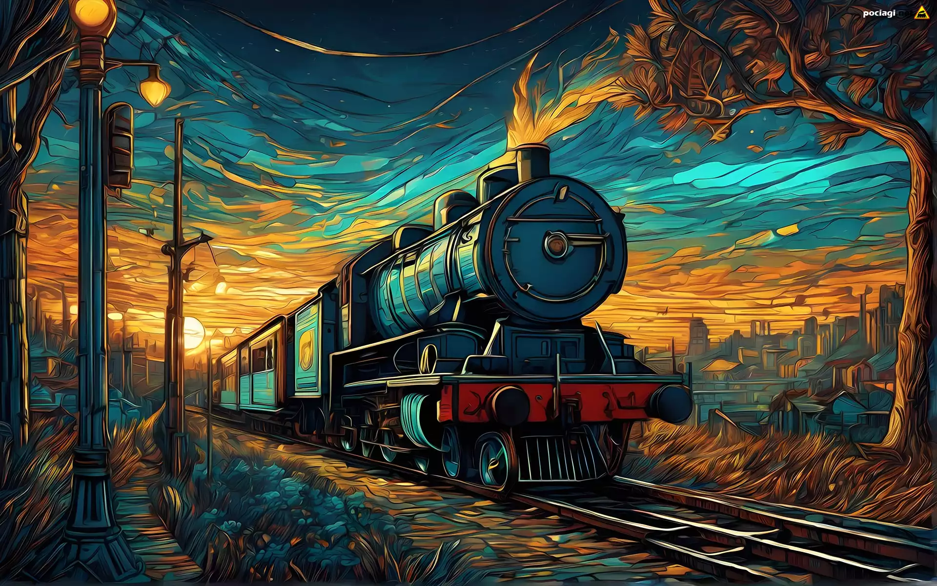 Pociąg parowy, Lokomotywa, Wagony, Tory, Drzewa, Domy, Światła, Grafika
