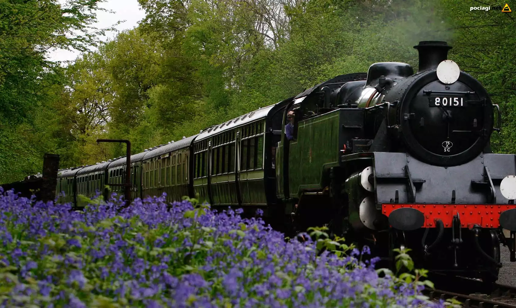 Pociąg, Lokomotywa, Drzewa, Kwiaty