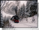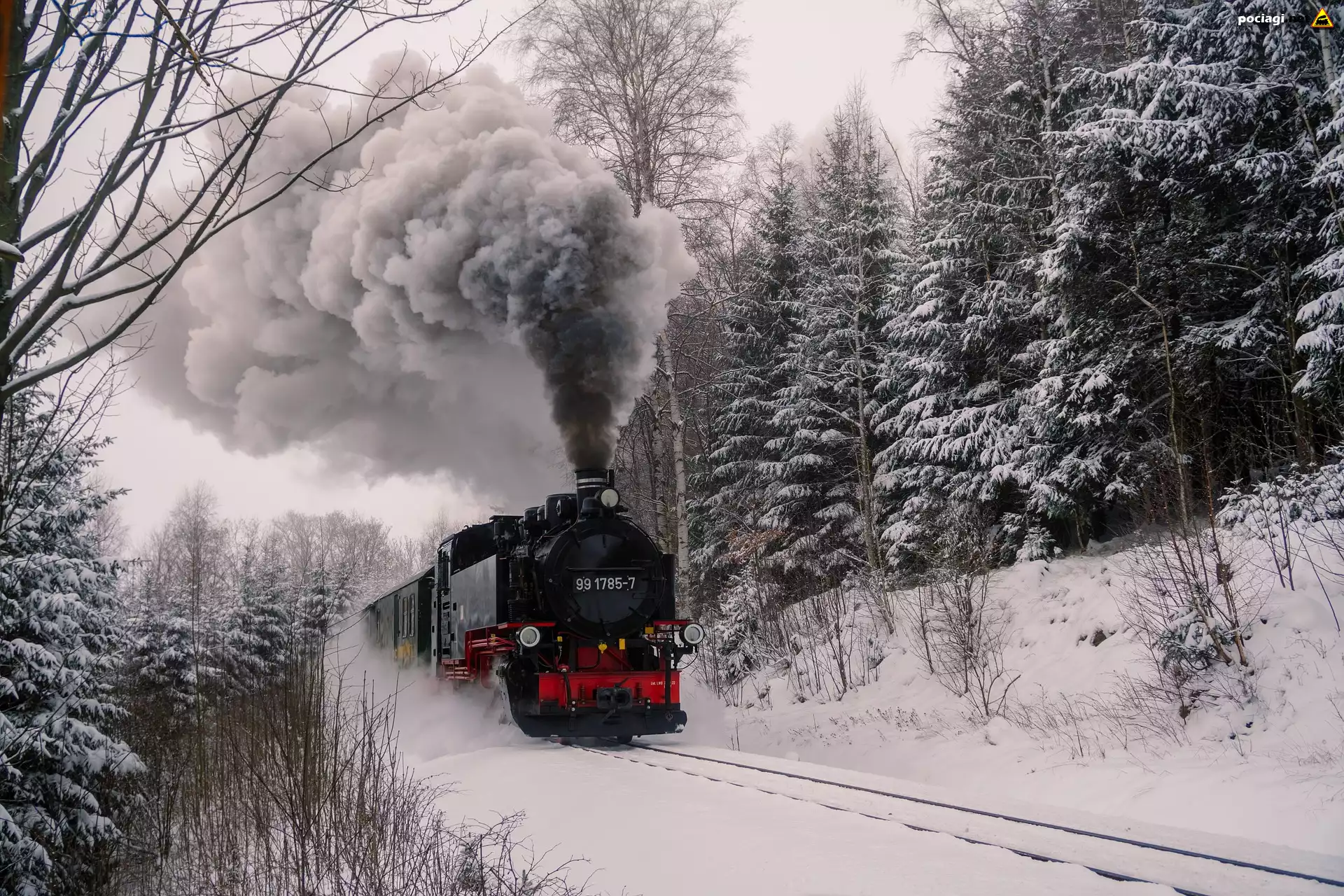 Pociąg, Lokomotywa parowa, Śnieg, Las, Zima, Drzewa
