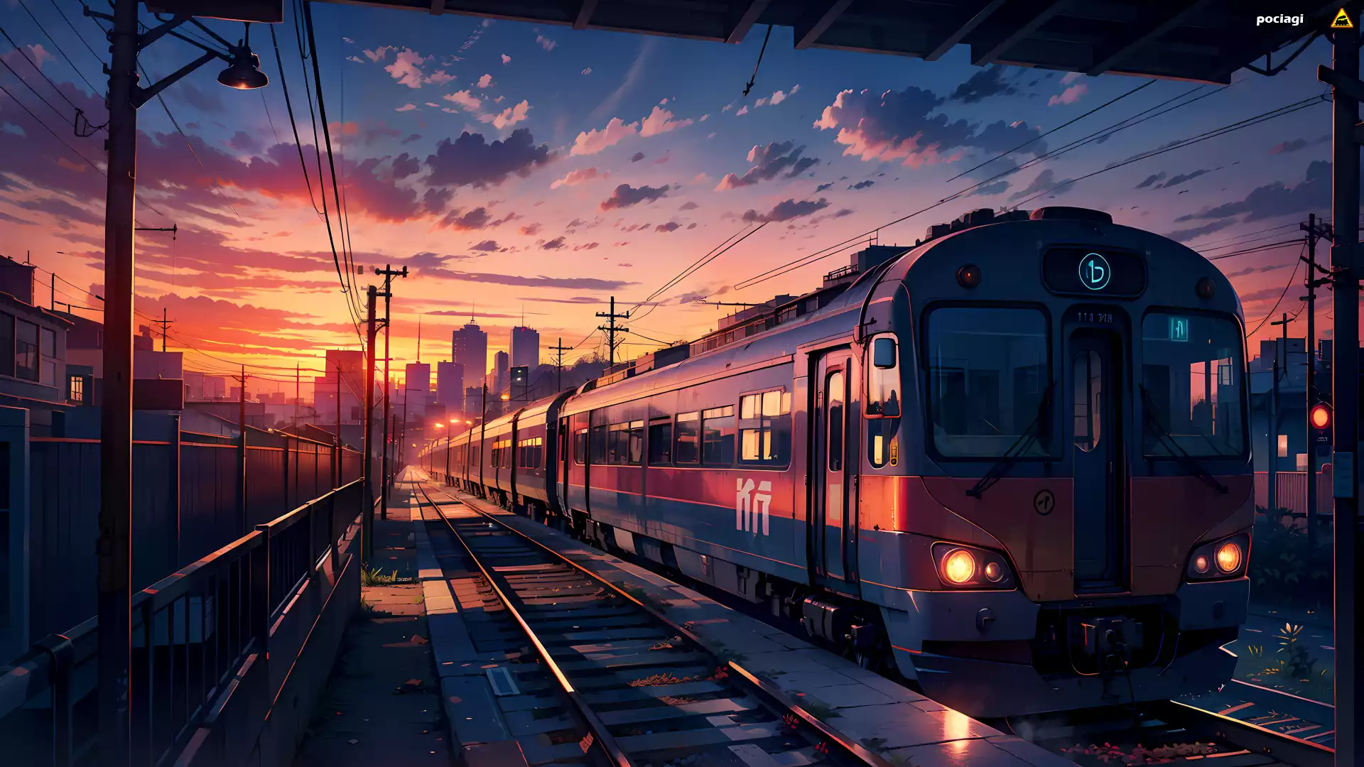 Pociąg, Tory, Peron, Zachód słońca, 2D