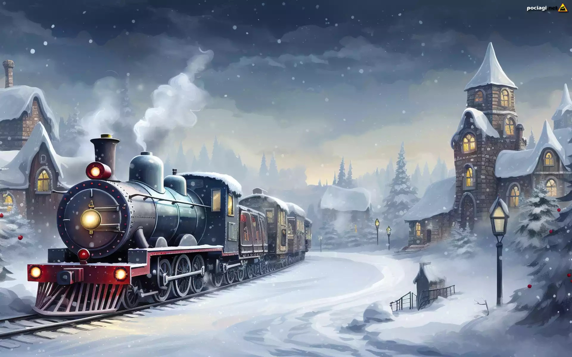 Zima, Pociąg, Drzewa, Domy, Latarnie, Niebo, Chmury, Śnieg, Mgła, 2D